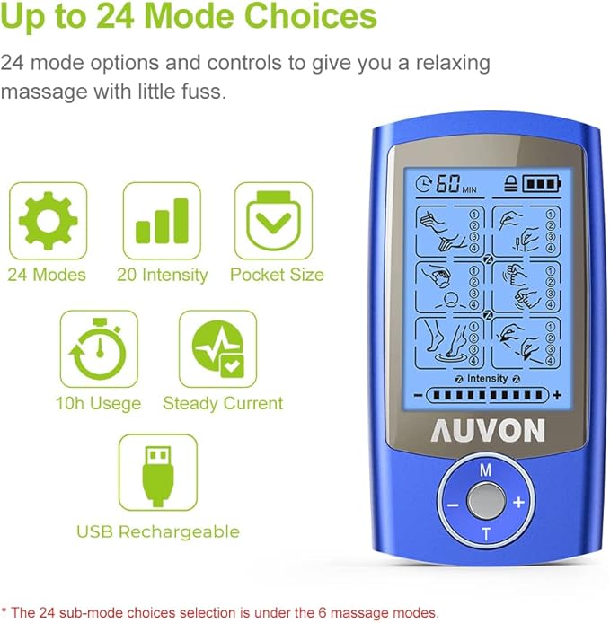 • Upgrade 24 Choices for Pain Relief: The AUVON electronic TENS device has as many as 24 user-friendly pre-programmed massage modes and adjustable timing, making it much easier to use than other traditional electric therapy products, which may require you to set the pulse frequency and duration of each pulse manually (the 24 sub-mode choices are under the 6 massage modes)