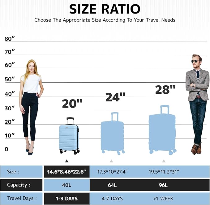 - [Carry-On 20 Inch] The 20-inch suitcase can meet the functions of boarding, travel, and daily storage, and can be brought on the plane without checking in. Size: 14.6*8.46*22.6 inches. Capacity: 40L.