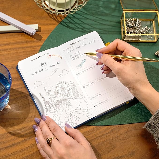 - POCKET FORMAT & PREMIUM QUALITY: This vacation planner measures just 3.9 by 6.9 inches to fit inside a small bag and has an eco-leather hardcover, thick 120gsm paper, pen loop, elastic, bookmark, pocket for loose notes, stickers, and user guide.