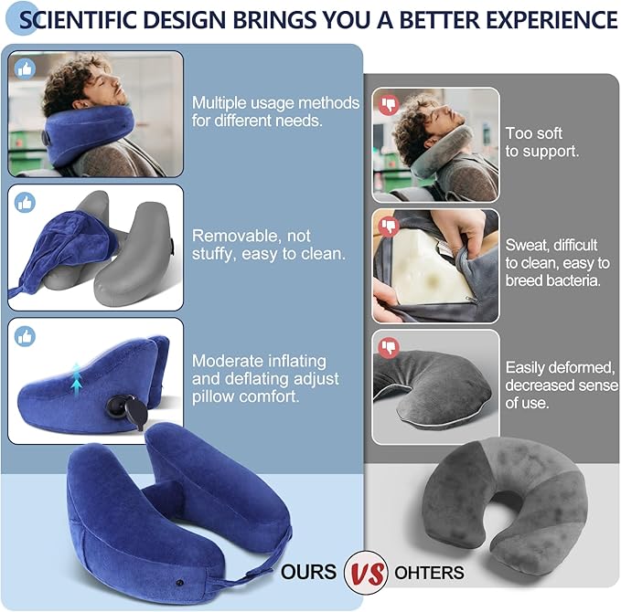 - 【Fast Filling】: The neck travel pillow can be inflated in 3 seconds without embarrassment in public. This patented valve maintains good air and does not leak for a long time. The most comfortable to relax if the travel neck pillow is blow up to 80-90%.