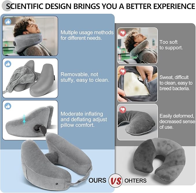 - 【Fast Filling】: The neck travel pillow can be inflated in 3 seconds without embarrassment in public. This patented valve maintains good air and does not leak for a long time. The most comfortable to relax if the travel neck pillow is blow up to 80-90%.