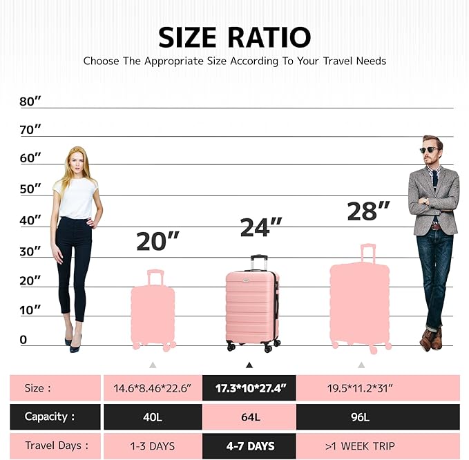 - [Checked-Medium 24 Inch] The 24-inch suitcase meets the functions of boarding, travel, and daily storage. Size: 17.3*10*27.4 inches. Capacity: 64L.