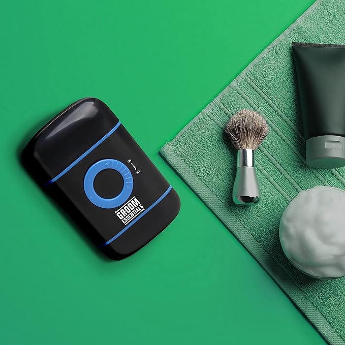 - CORDLESS TRAVEL FOIL SHAVER: The Groom Essentials electric face shaver is a powerful and compact grooming tool that you can bring and use anywhere. It features a foil shaver with a pop-up precision beard trimmer, a protective cap, and a rotating power switch. This device comes with a cleaning brush. It requires 2 AA batteries (not included).