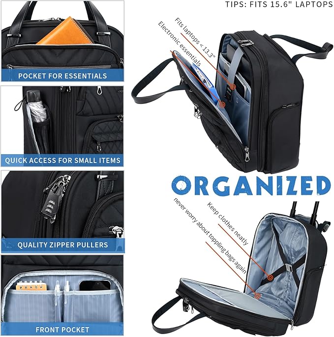 - MULTI- FUNCTION PERSONAL BAG: Spacious main compartment works well for clothes/shoes. Features a padded laptop compartment that fits laptops up to 15.6 inches. Easy-access front organizer for small items. Both sides with zipper pockets for the battery and water bottle.