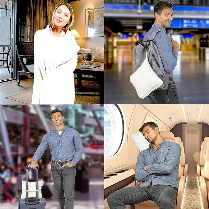 - Soft plush travel blanket/pillow: This luxurious ivory-white patented travel blanket is lightweight and easily portable. Made from super soft plush fabric. This makes it your go-to choice and an ideal travel essential for any traveler. This airplane travel blanket will keep you warm and snuggly in all seasons, yet it’s light enough to carry around. Travelers can sleep soundly with it on airplanes!