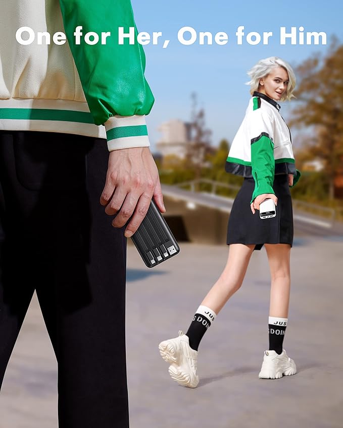 - đăPortable charger with built in cablesăSlim portable charger built-in 4 cables included 3 output cables and 1 input cable. Total 3 output cables can charge almost for all types port devices. Such as for iPhone, iPad, for Samsung, for other USB C port phones, tablets, and also for Micro devices. All in one portable charger, you would not need to carry various cables or adapter any more!!! This version is 2 pcs portable chargers as one set.