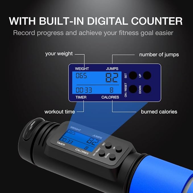 - Jump Rope with Smart Counter: Designed with HD LED display, which shows Timer, Weight, Calorie and Circles. It will record the number of circles you jump and show the calories been burn. Simply set your weight and workout to reach your fitness goal at any time