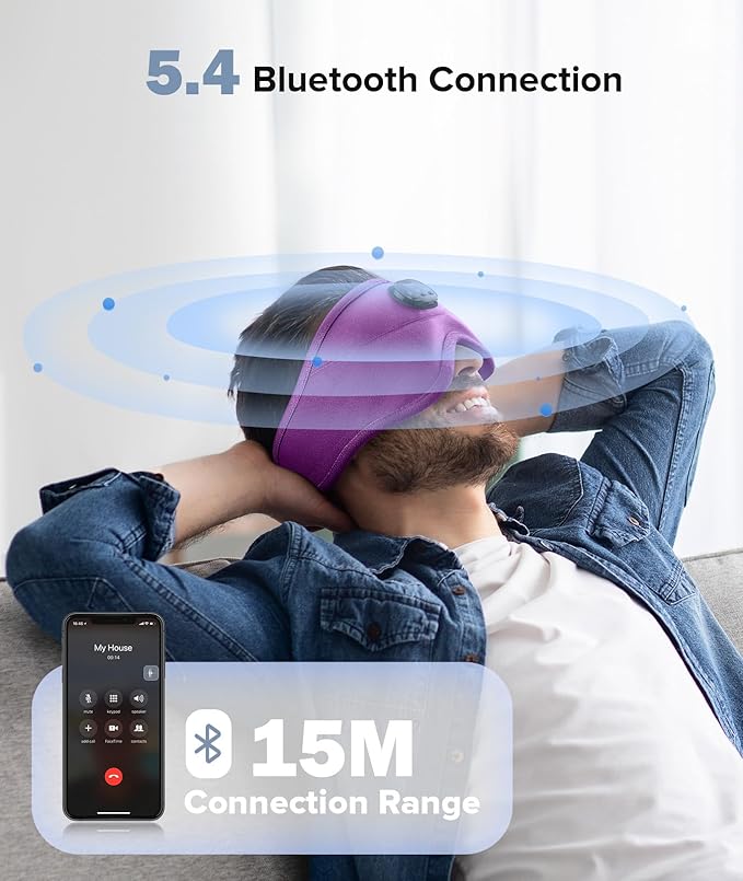 - 5.4 Bluetooth Headband Sleep Mask: Upgraded 5.4 Bluetooth version not only includes a microphone and speakers for phone audio and calls, but also offers substantial improvements in connection range and smoothness. Enjoy smoother, uninterrupted calls and audio playback within a 10-meter range