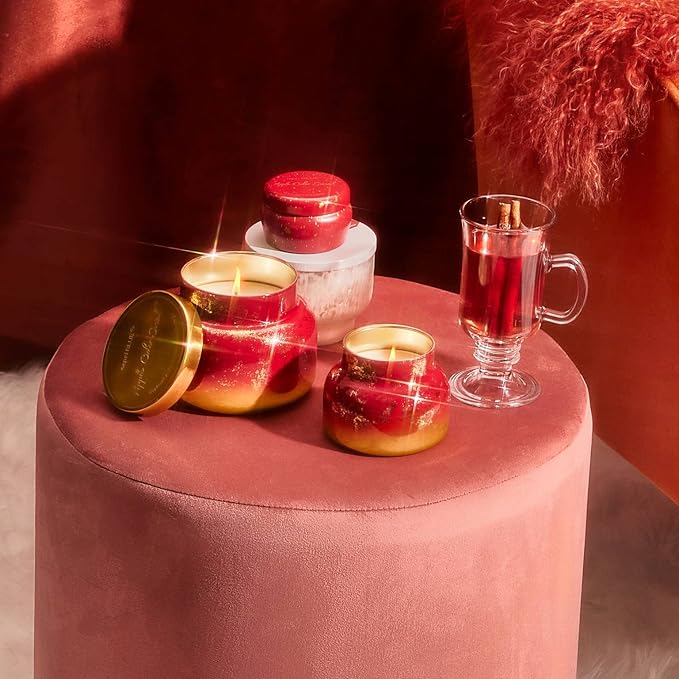 Capri Blue Glimmer Petite Signature Jar Candle - Apple Cider Social Scented Candle with Ombre Glass Candle Holder - Luxury Aromatherapy Candle - Red and Gold (8 oz)