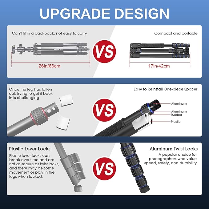 - Portable Tripod: The weight of the camera tripod (including the ball head) is only 3.76 lbs. To store the travel tripod, the legs can be folded back to create a compact 16.5" tripod, making it easy to carry for field photography