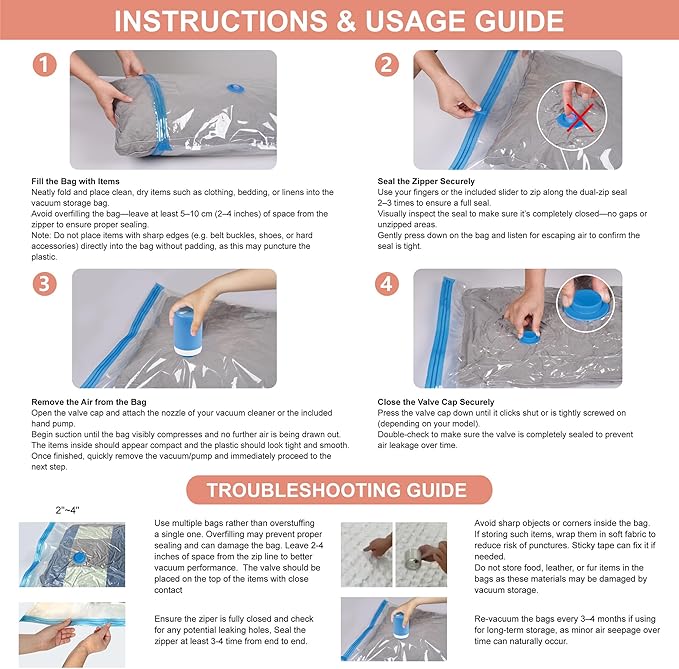- Reliable protection: With the triple-seal turbo valve & double-zip seal design, our vacuum bags effectively get the air out in the suction process. The robust PA+PE bag material protects your items from dirt, dust, and damage for long-term storage. Can be used repeatedly.
