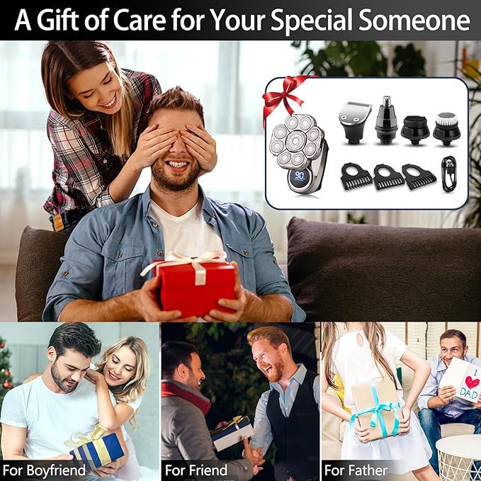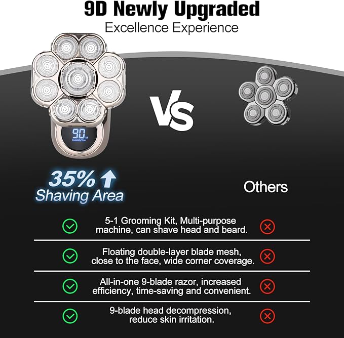 - 【Upgraded 9D Floating Head Shaver】The mens electric shavers is equipped with 9 sharp floating heads and double ring blades.Can perfectly follows the contours of your face,the head,the neck and jaw line.Electric shaver will not pull your hair and beard,reduce irritation to the skin and scalp,and improves the comfort and closeness of the shave.It ensure gentle and efficient shave to save your valuable time.