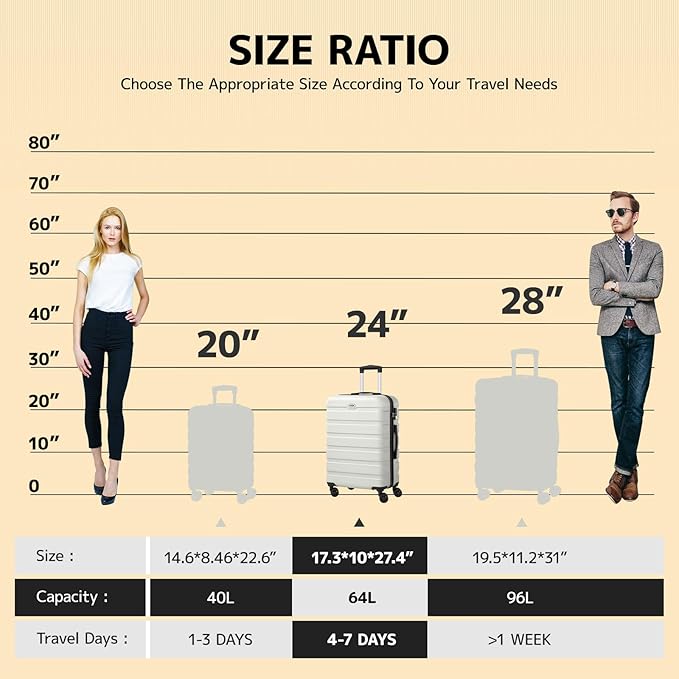 - [Checked-Medium 24 Inch] The 24-inch suitcase meets the functions of boarding, travel, and daily storage. Size: 17.3*10*27.4 inches. Capacity: 64L.
