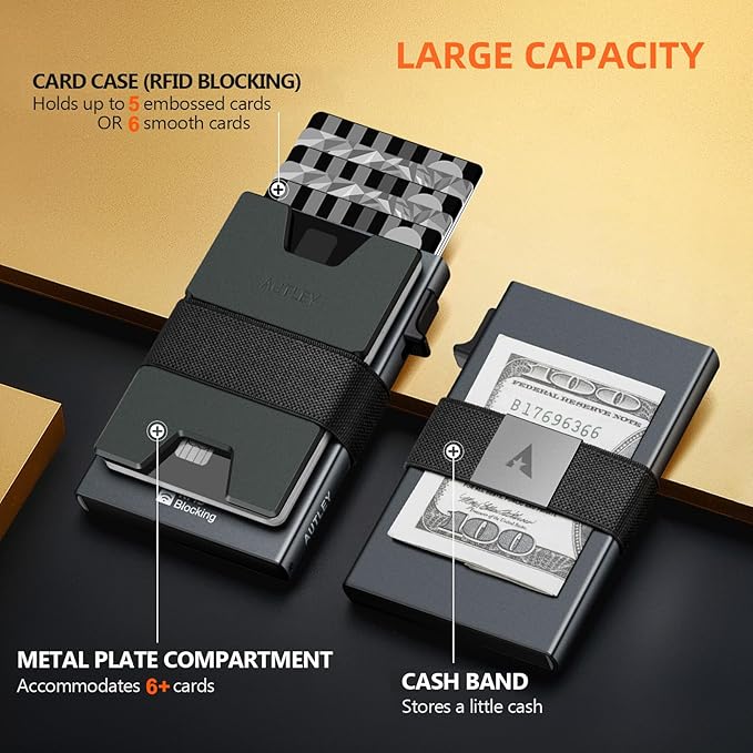 - 【Large Capacity】Inside - Card box can hold up to 5 embossed or 6 smooth cards. Outside - The metal plate compartment can hold additional 6+ cards. The elastic band(the side without the plate) can hold a few bills and receipts.