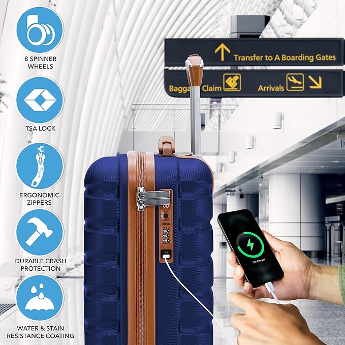 Carry On Suitcase Hardside Built In TSA Lock & USB Port Silent Double Spinner Wheels Maximum Underseat Carry-On Bag For American & United Approved Airlines( 18x14x8" ,Navy/Tan )
