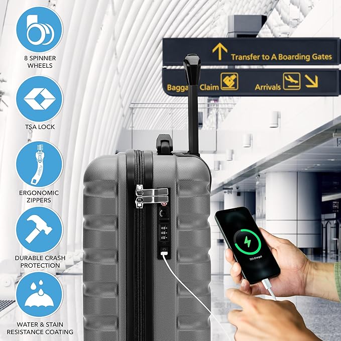 Carry On Suitcase Hardside Built In TSA Lock & USB Port Silent Double Spinner Wheels Maximum Underseat Carry-On Bag For American & United Approved Airlines( 18x14x8" ,Charcoal )