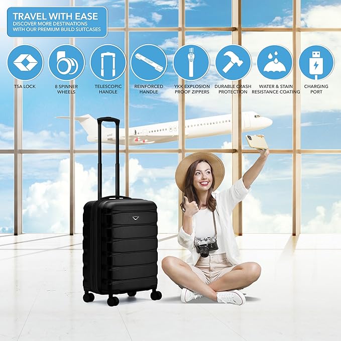 Carry On Suitcase Hardside Built In TSA Lock & USB Port Silent Double Spinner Wheels Maximum Overhead Carry-On Bag For Virgin & South West Approved Airlines( 24x16x10" ,Black )
