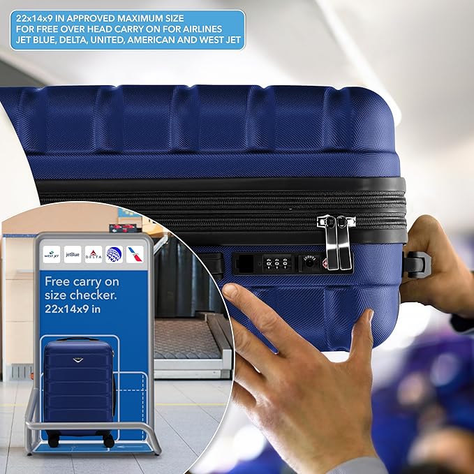 - AIRLINE COMPATIBILITY: The cabin size luggage is compatible with over 100 airlines operating in the USA and around the globe. Including American, Delta, Alaska, Jet Blue (Blue, Blue Extra, Blue Plus and Mint fares) and United (Premier member or a primary card member) approved Airlines. Tested using the airlines baggage sizer this cabin bag comfortably fits in the overhead locker and will avoid airline charges. The perfect purchase for your next trip by plane, train, vessel, coach or car.