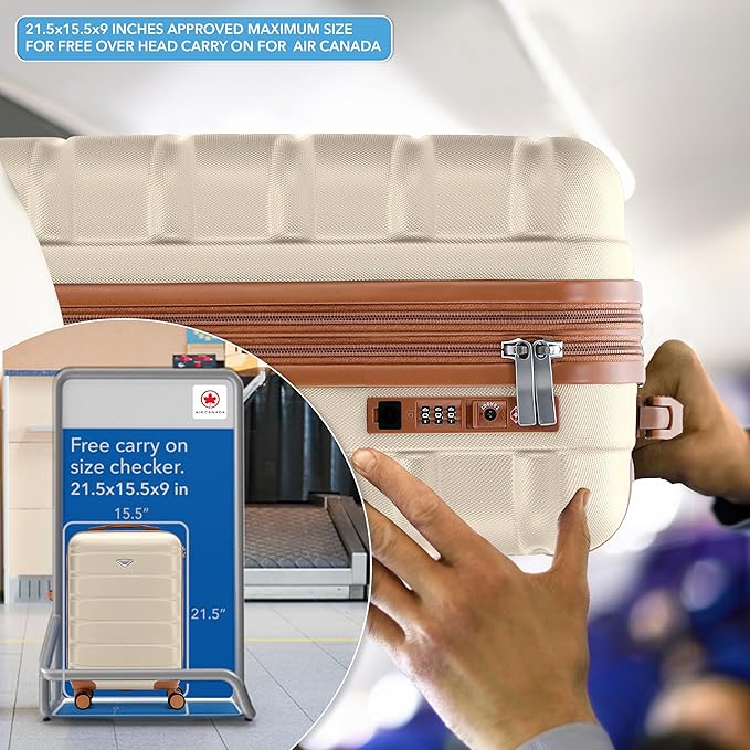 - AIRLINE COMPATIBILITY: The cabin size luggage in this set is compatible with over 100 airlines operating in the USA and around the globe. Designed to be the maximum carry-on size for Air-Canada. Tested using the airlines baggage sizer this cabin bag comfortably fits in the overhead locker and will avoid airline charges. The perfect purchase for your next trip by plane, train, vessel, coach or car.