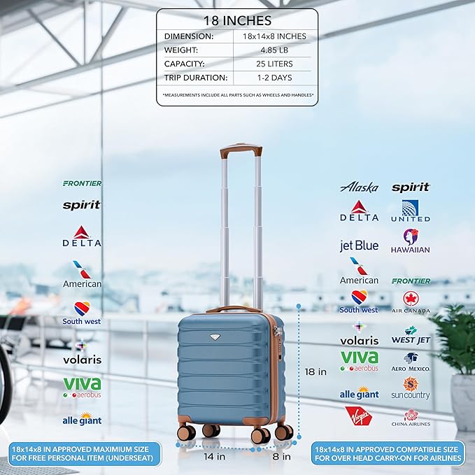 - AIRLINE COMPATIBILITY: The cabin size luggage in this set is compatible with over 100 airlines operating in the USA and around the globe. The perfect size for a secondary carry-on (Personal Item) for American, Delta, Spirit and Alaska. Carry-On with Jet Blue (Blue, Blue Extra, Blue Plus and Mint fares) and United (Premier member or a primary card member) approved Airlines. Tested using the airlines baggage sizer this cabin bag comfortably fits under your seat and will avoid airline charges.