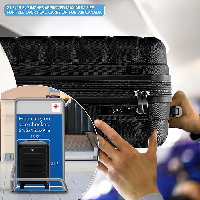 - AIRLINE COMPATIBILITY: The cabin size luggage in this set is compatible with over 100 airlines operating in the USA and around the globe. Designed to be the maximum carry-on size for Air-Canada. Tested using the airlines baggage sizer this cabin bag comfortably fits in the overhead locker and will avoid airline charges. The perfect purchase for your next trip by plane, train, vessel, coach or car.