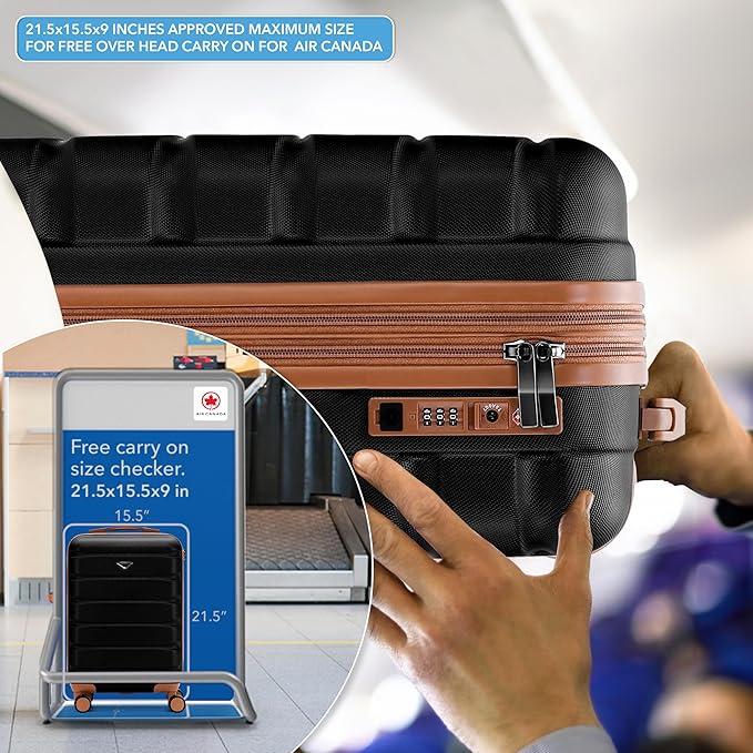 - AIRLINE COMPATIBILITY: The cabin size luggage in this set is compatible with over 100 airlines operating in the USA and around the globe. Designed to be the maximum carry-on size for Air-Canada. Tested using the airlines baggage sizer this cabin bag comfortably fits in the overhead locker and will avoid airline charges. The perfect purchase for your next trip by plane, train, vessel, coach or car.