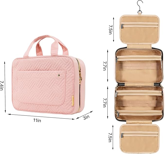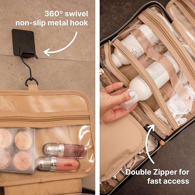 - Hanging Toiletry Organizer Bag : Store all your toiletries, from hair products to makeup to dental accessories in our water resistant travel makeup bag. Our travel cosmetics organizer includes added padding to protect your valued toiletries, and a 360 degree swivel hook so you can hang our bags wherever you need it whether it be an overnight trip, weekender excursion, cruise or international airplane travel.
