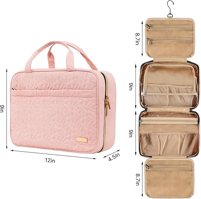 - Effortless Transport : Use the soft handle to carry your travel toiletries bag wherever your life takes you. Hang your cosmetic bag wherever you need it with the 360 degree swivel hook in the bathroom, hotel or your home bedroom, for easy access to all your products. Have everything ready, from your makeup to your shampoo.