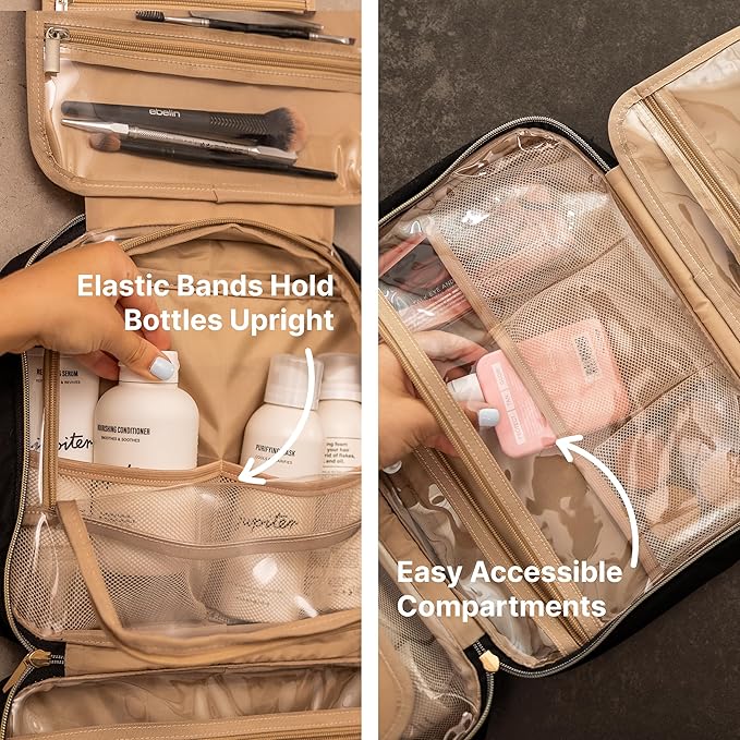 - Leak Proof Sections : Keep your travel accessories safe and dry from leaks with our functionally designed womens hanging cosmetic bag. Our design features two main leak proof chambers that are water resistant with mesh pouches and elastic bands to keep bottles upright, with different straps for all your beauty bottles.