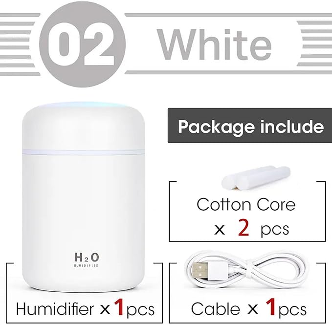 Portable Mini Humidifier, Colorful, Cool Mist, USB Powered. Perfect for Bedroom, Office & Car (300ml, White)