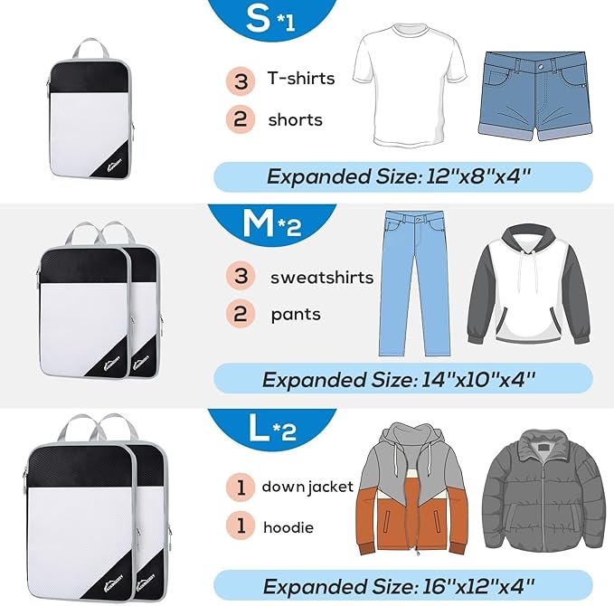 - PACKAGE INCLUDES: Our 5-set compressible packing cubes contains 2 large packing cubes (16''x12''x4''), 2 medium packing cubes (14''x10''x4''), and 1 small packing cube (12''x8''x4'')