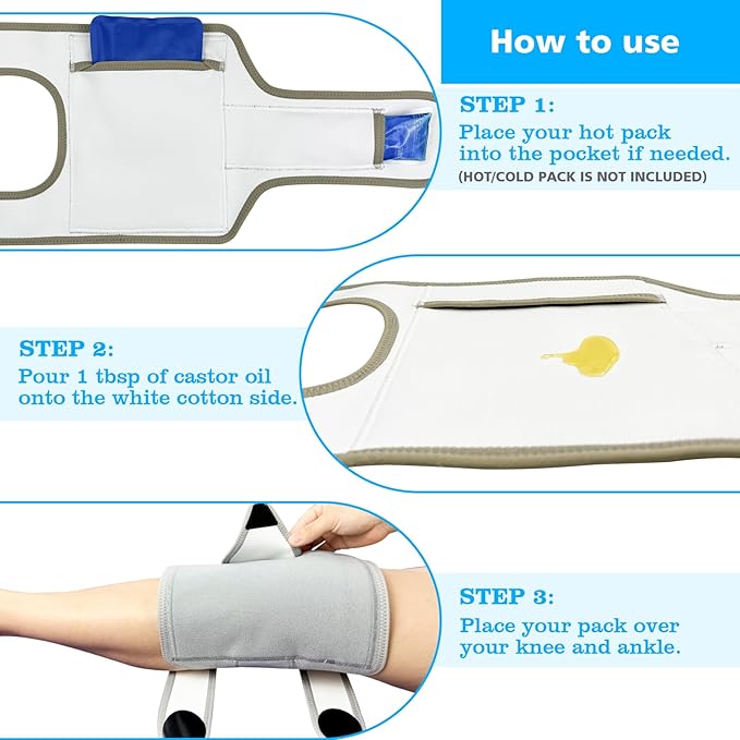 - Castor Oil Application Pack Wrap - Facilitates easy and mess-free application of castor oil to the affected knee and ankle joints. Aids in reducing pain, inflammation, and discomfort associated with knee and ankle conditions, such as arthritis, strains, and sprains.