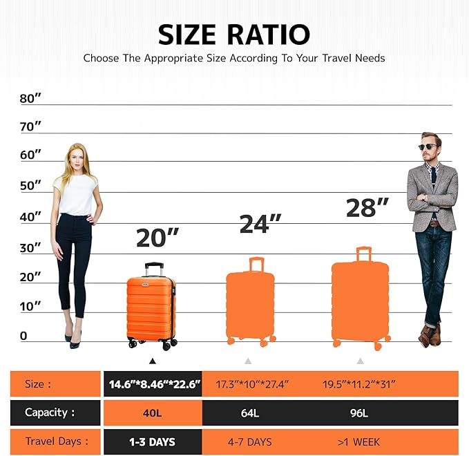 - [Carry-On 20 Inch] The 20-inch suitcase can meet the functions of boarding, travel, and daily storage, and can be brought on the plane without checking in. Size: 14.6*8.46*22.6 inches. Capacity: 40L.