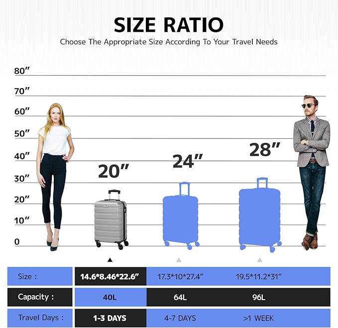 - [Carry-On 20 Inch] The 20-inch suitcase can meet the functions of boarding, travel, and daily storage, and can be brought on the plane without checking in. Size: 14.6*8.46*22.6 inches. Capacity: 40L.