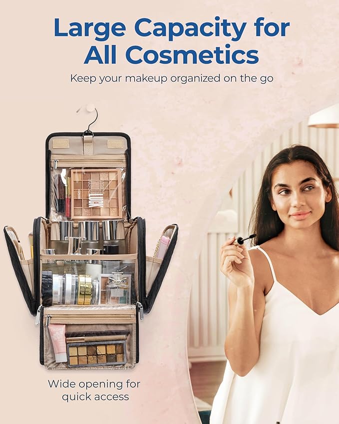 BAGSMART Makeup Bag for Women with Hanging Hook - Portable Cosmetic Case, Large Capacity Door Room Essentials Travel Organizer for Full Sized Cosmetics and Toiletries, Black