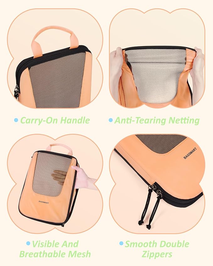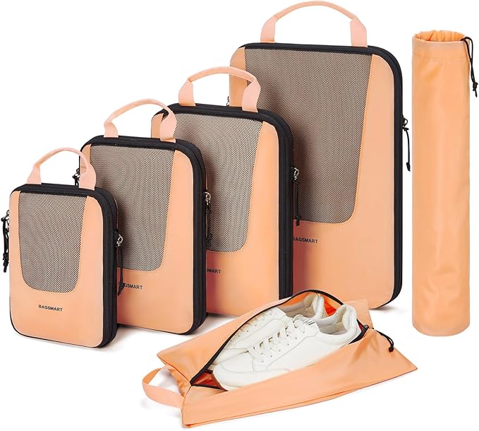 • Compression Packing Cubes - Are you fed up with the travel kind of messy suitcase? Travel with BAGSMART PACKING CUBES and they make a world of difference. The 6-piece packing cubes contains 4 travel cubes + 1 laundry bag + 1 shoe bag, keeps your outfits in separate compression cubes, and makes your luggage clean and neat while traveling