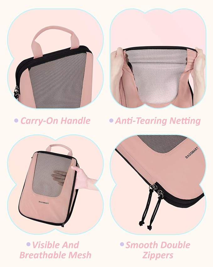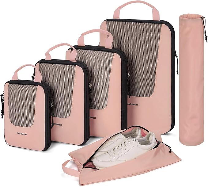 • Compression Packing Cubes - Are you fed up with the travel kind of messy suitcase? Travel with BAGSMART PACKING CUBES and they make a world of difference. The 6-piece packing cubes contains 4 travel cubes + 1 laundry bag + 1 shoe bag, keeps your outfits in separate compression cubes, and makes your luggage clean and neat while traveling