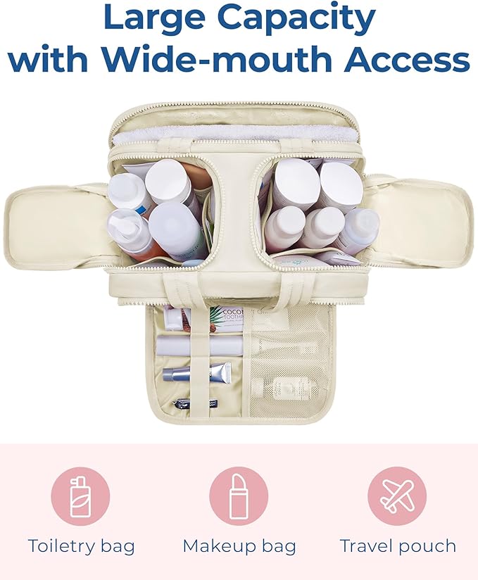 BAGSMART Travel Toiletry Bag, Lightweight Large Wide-open Travel Bag for Women, Puffy Cosmetic Makeup Bag Organizer with Handle for Accessories,Essentials, Toiletries, Beige
