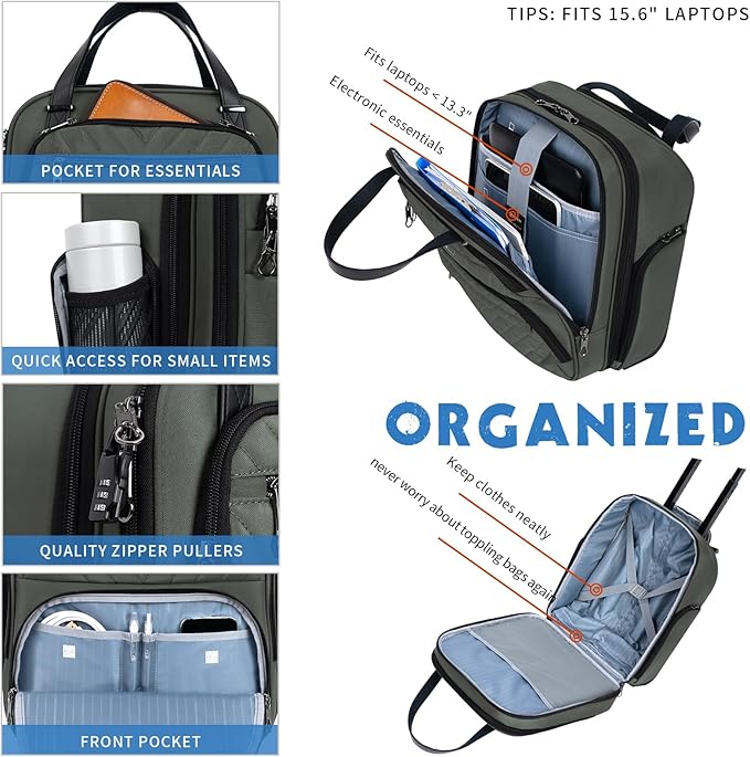 - MULTI- FUNCTION PERSONAL BAG: Spacious main compartment works well for clothes/shoes. Features a padded laptop compartment that fits laptops up to 15.6 inches. Easy-access front organizer for small items. Both sides with zipper pockets for the battery and water bottle.