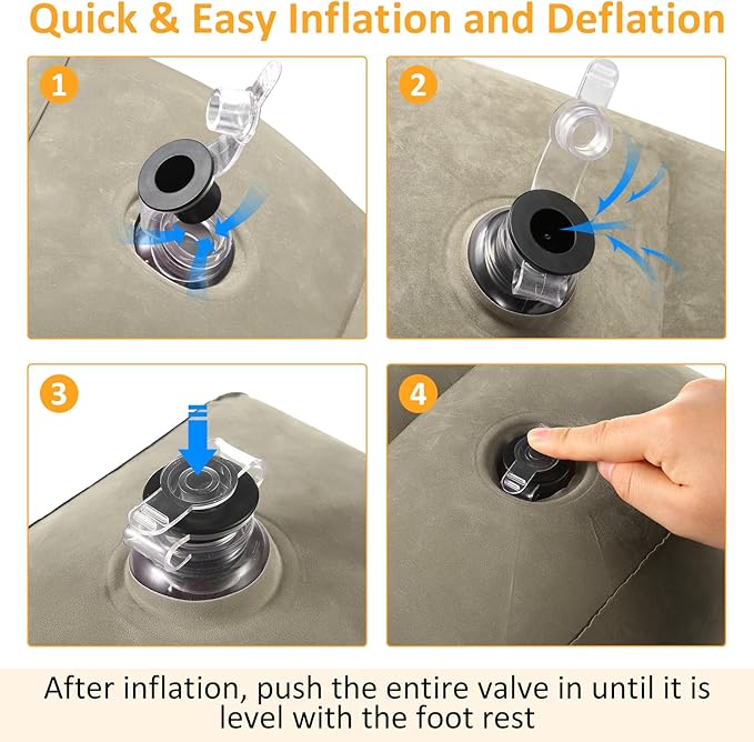 - Double Cap Valve - Our inflatable foot rest pillow with 2-in-1 double valve,the upper black air valve is a one-way air inlet for inflating or replenishing gas.bottom transparent air valve can be quickly inflated and deflated,when you are done blowing it up, push clear cover on and push whole valve in so that it is flush with the side of the travel foot pillow,the airplane footrest takes away the hassle of bringing a pump and making noise in flight.