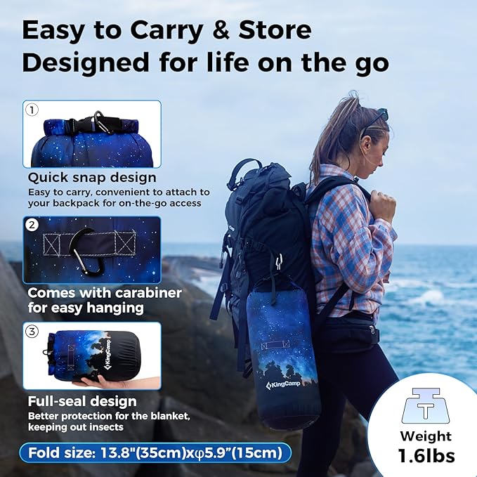 - LIGHTWEIGHT & PORTABLE - WARMTH ON THE GO: This camping blanket unfolds to a spacious 79"L × 57"W and weighs only 1.63 lbs-lighter than a bottle of water. It offers full coverage without the bulk. It compresses down to 13.8" × 6.7" × 6.7" in the included double-drawstring stuff sack, making it the ideal packable blanket for travel, backpacking, hiking, or road trips. Stay warm anywhere, anytime.