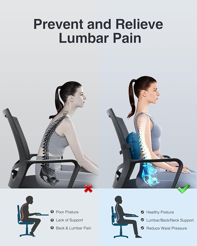 - 【Effective Lumbar Pain Relief】: Do you feel discomfort in your waist due to prolonged sitting? This inflatable lumbar pillow will perfectly help you, it is designed ergonomically to relieve lower back pain and back tightness, supports you in achieving right posture and helps maintain a gentle curve in the spine.