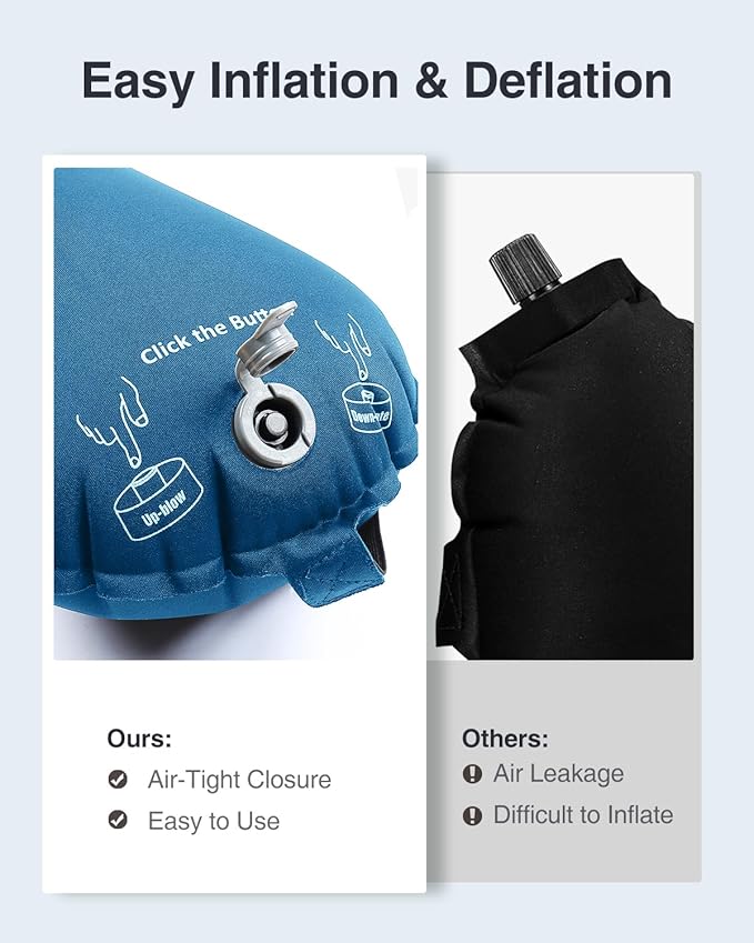 - 【Upgraded Valve Design】: Our inflatable travel pillow uses the Press Type air valve, it will naturally inflate to an unsaturated state in 1~2 minutes by pressing the button, and its inflatable design allows you to customize the firmness to your desired level, this ensures that you get the perfect amount of support and comfort for your specific needs.