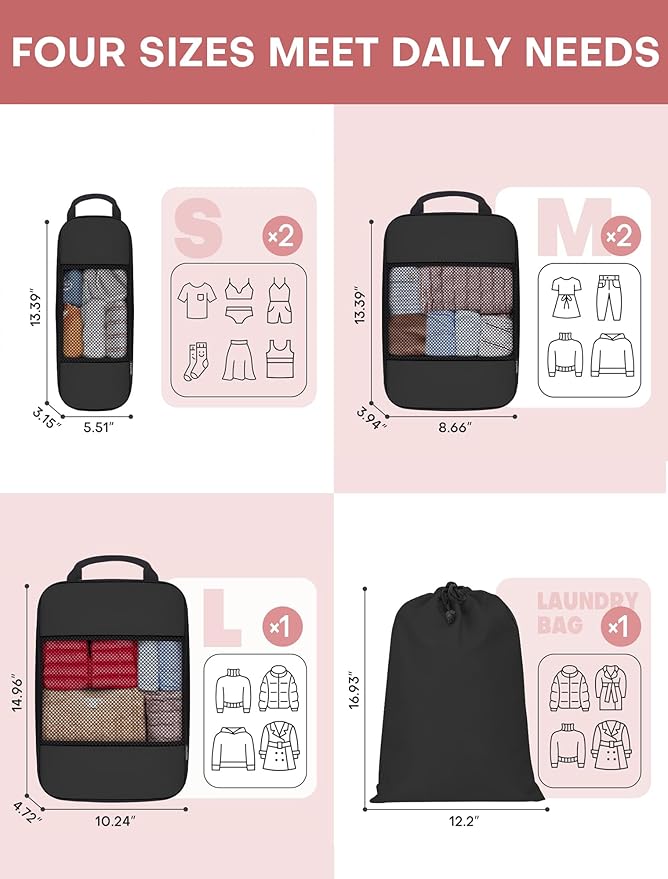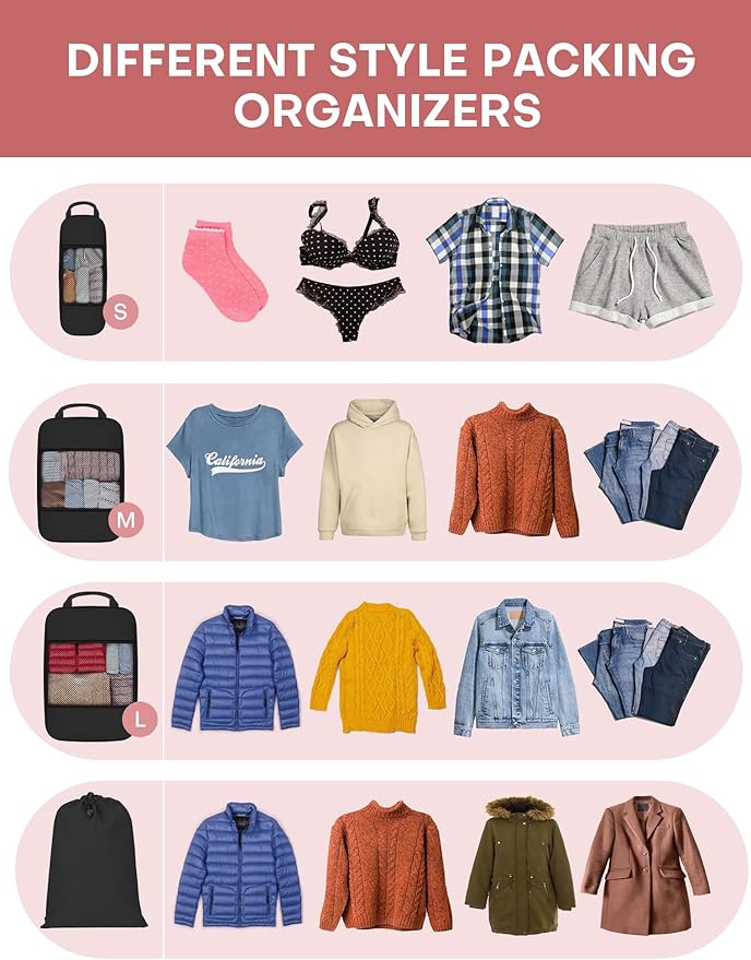 - VERSATILE & FLEXIBLE: Includes 6 pcs organizers for different items: 2 small cubes, 2 Medium cubes, 1 Large cube and 1 drawstring pocket. Moreover, these packing cubes can be used to stay organized at home, while traveling, and are perfect for camping or any outdoor adventure! You can easily fit them into your suitcases, totes, backpacks, duffel bag, etc.