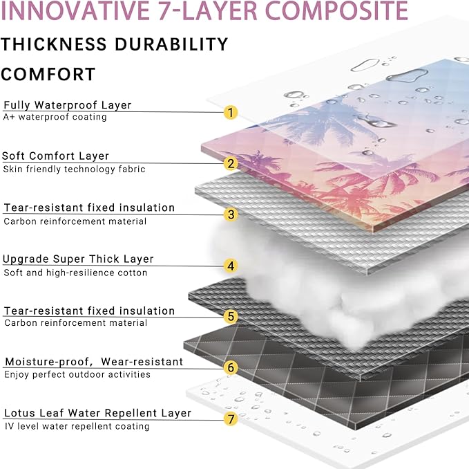 - [7-Layer Structure]This picnic mat features an advanced 7-layer structure design, with a soft cotton layer in the middle that provides excellent cushioning. This ensures a comfortable sitting and lying experience during outdoor activities. Whether you're on grass, sand, or using it indoors, it offers ample support.