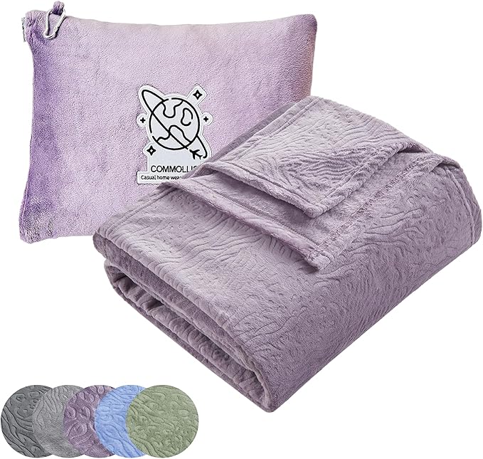 Commollis 2-in-1 Travel Blanket & Pillow for Airplane, Car, Train - Warm Compact Flight Blanket with Luggage Strap & Backpack Clip, Machine Washable, All-Season Use