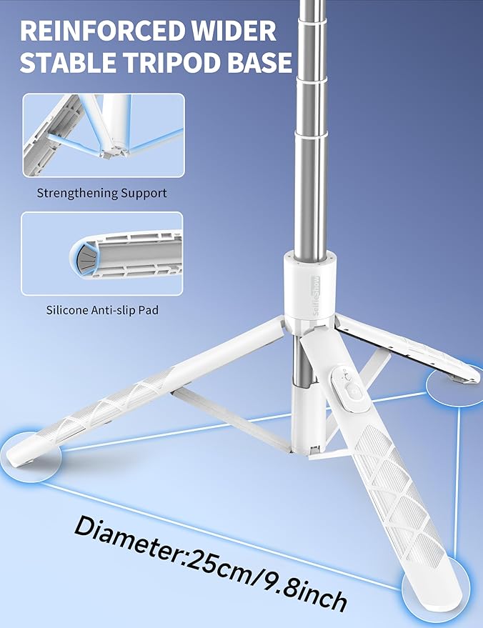 - ✅【Unlimited 360° Rotation & Detachable Remote】: SelfieShow tripod for iphone can be rotated 360°, support top down, back up, horizontal and vertical screen rotation, free photo angle to meet your daily shooting needs. The portable tripod selfie stick comes with a remote that compatible with iOS and Android. Supports a maximum shooting distance of 33 feet. The remote trigger is conveniently embedded in the selfie stick tripod's leg, ensuring that it won't get lost.