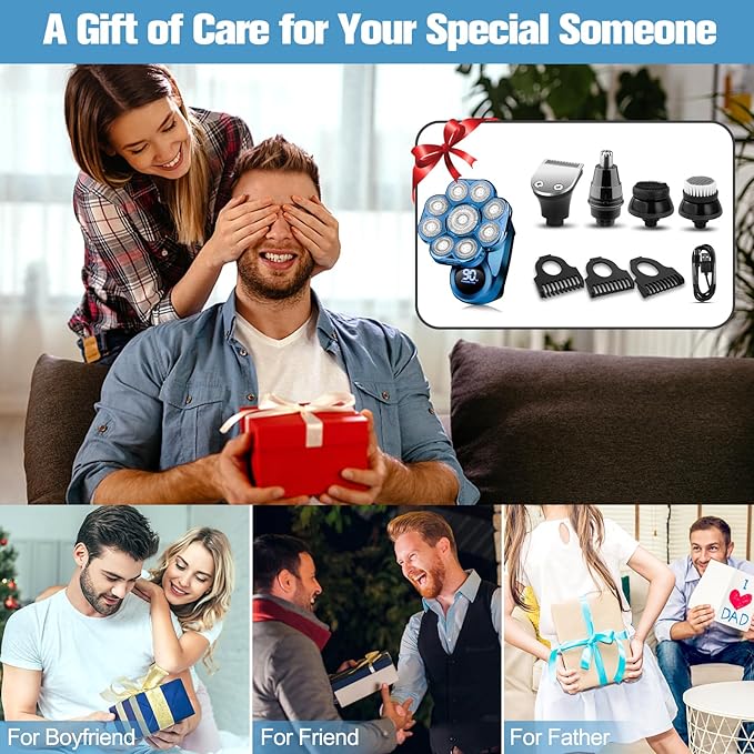 - 【6-in-1 Grooming Kit】Electric shavers for men includes 6 detachable Accessories, Head/Beard Shaver, Nose/Ear Hair Trimmer, Hair Trimmer(3/5/7mm), Facial Massage Brush, Facial Cleaning Brush, Body Trimmer. Professional 6 in 1 Multifunctional electric shavers, Different types of head razor shaver accessories meet all your personal facial shaving needs for beard and hair. Great for husband, partner, father, friends and brothers