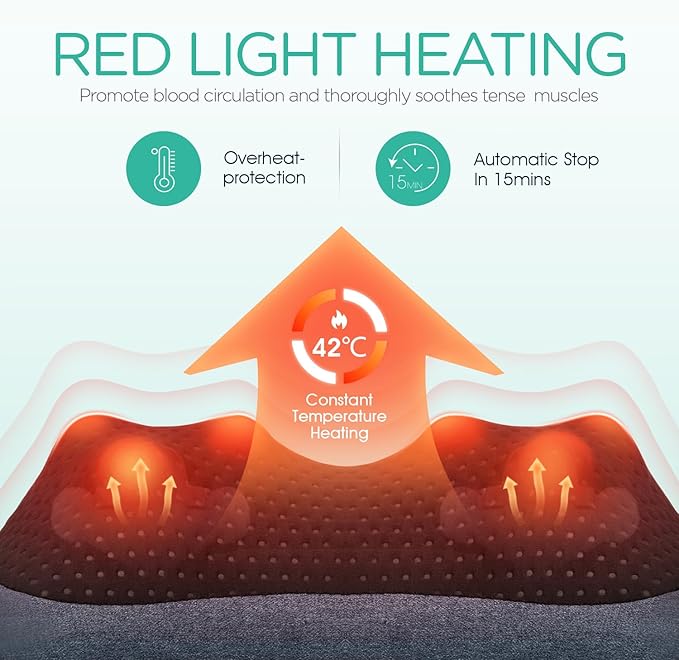 - Red Light Constant Temperature Heating - Massage pillow is equipped with an advanced relaxation heating system, which can transfer heat to muscles and penetrate skin tissue to relieve body stress and promote blood circulation. This massager is especially suitable for giving to friends and elders. It is not only a gift, but also a care and warmth that will sweep away their fatigue.