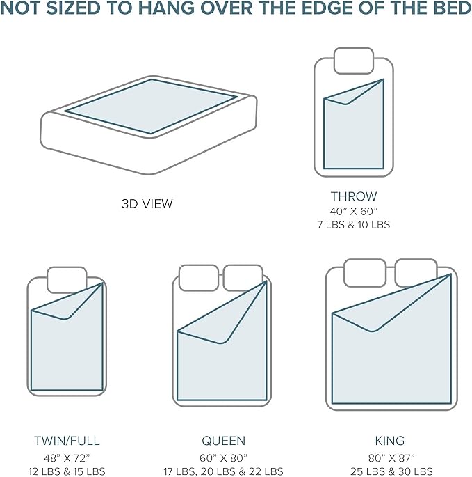 - HOW TO CHOOSE: The weight of the blanket should be about 10% of your body weight. For example, a 150 lb adult would use a 15 lb weighted blanket, and a 65 lb child would use a 7 lb weighted blanket. The blanket should be no longer in size than the top of your mattress and should not hang over the sides of your bed. Please reference our chart to determine which blanket is right for you.